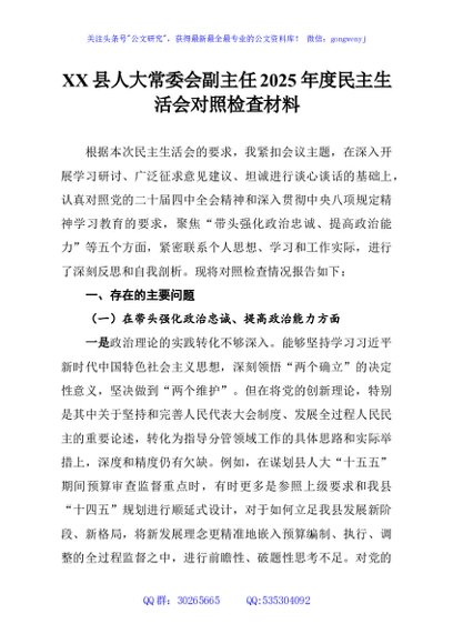 / XX县人大常委会副主任2025年度民主生活会对照检查材料