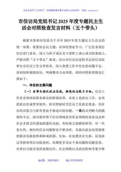 / 市信访局党组书记2025年度专题民主生活会对照检查发言材料(五个带头)