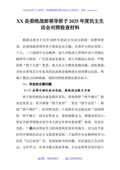 / XX县委统战部领导班子2025年度民主生活会对照检查材料