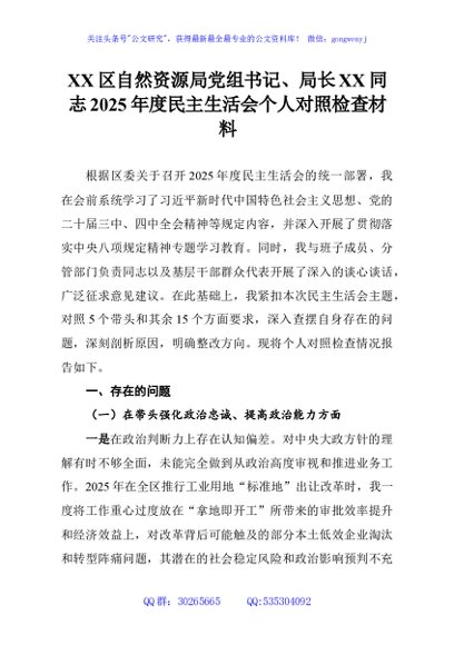 / XX区自然资源局党组书记、局长XX同志2025年度民主生活会个人对照检查材料