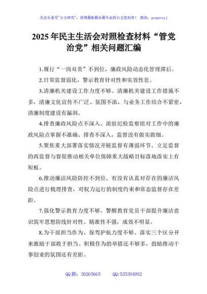 / 2025年民主生活会对照检查材料“管党治党”相关问题汇编