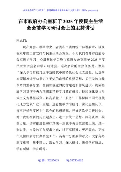 / 在市政府办公室班子2025年度民主生活会会前学习研讨会上的主持讲话
