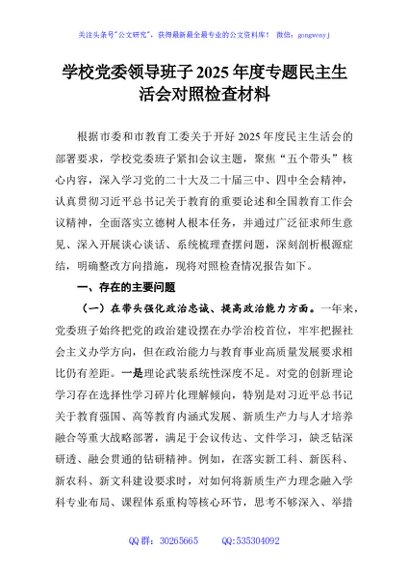 / 学校党委领导班子2025年度专题民主生活会对照检查材料