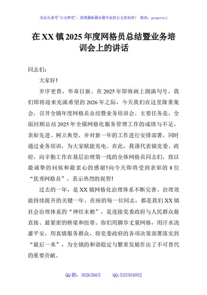 / 在XX镇2025年度网格员总结暨业务培训会上的讲话
