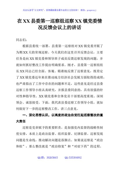 / 在XX县委第一巡察组巡察XX镇党委情况反馈会议上的讲话