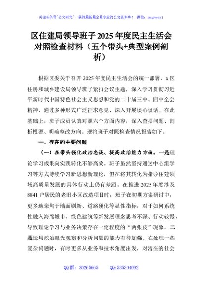 / 区住建局领导班子2025年度民主生活会对照检查材料(五个带头+典型案例剖析)