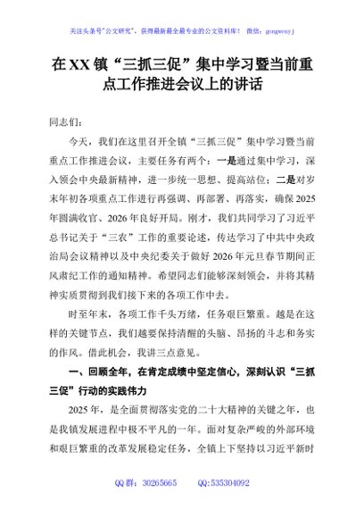 / 在XX镇“三抓三促”集中学习暨当前重点工作推进会议上的讲话