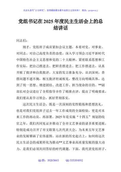 / 党组书记在2025年度民主生活会上的总结讲话