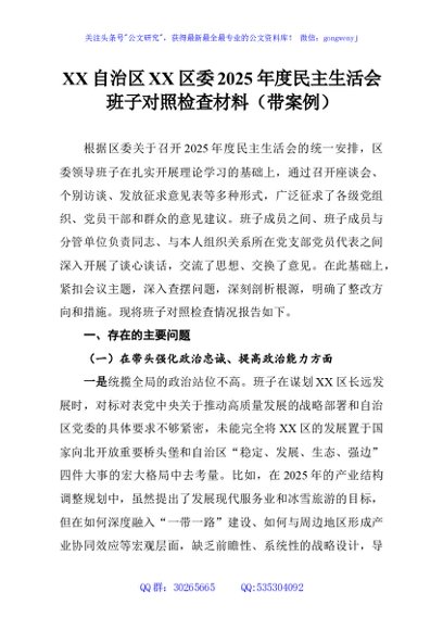 / XX自治区XX区委2025年度民主生活会班子对照检查材料(带案例)