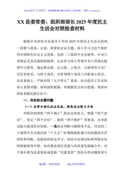 / XX县委常委、组织部部长2025年度民主生活会对照检查材料