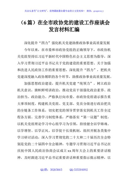 (6篇)在全市政协党的建设工作座谈会发言材料汇编