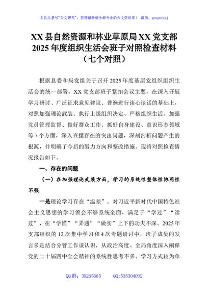 / XX县自然资源和林业草原局XX党支部2025年度组织生活会班子对照检查材料(七个对照)