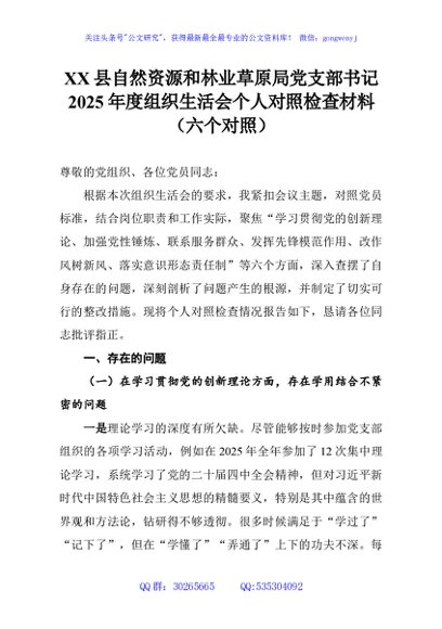 / XX县自然资源和林业草原局党支部书记2025年度组织生活会个人对照检查材料(六个对照)