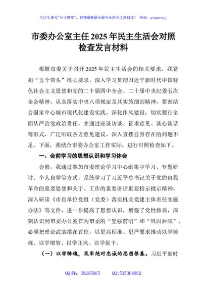 / 市委办公室主任2025年民主生活会对照检查发言材料