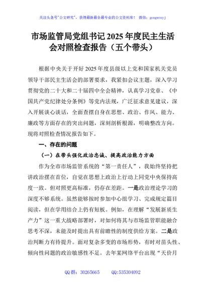 / 市场监管局党组书记2025年度民主生活会对照检查报告(五个带头)