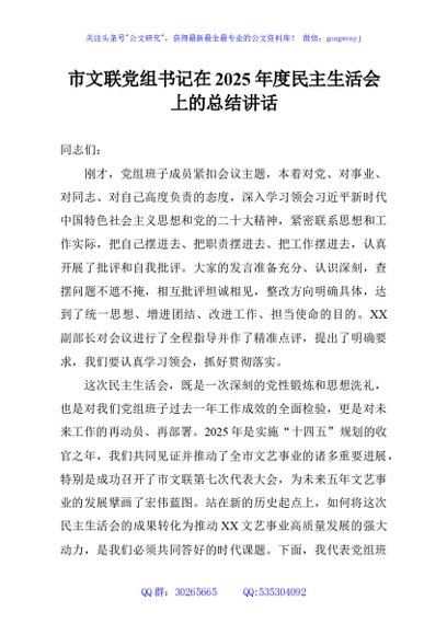 / 市文联党组书记在2025年度民主生活会上的总结讲话