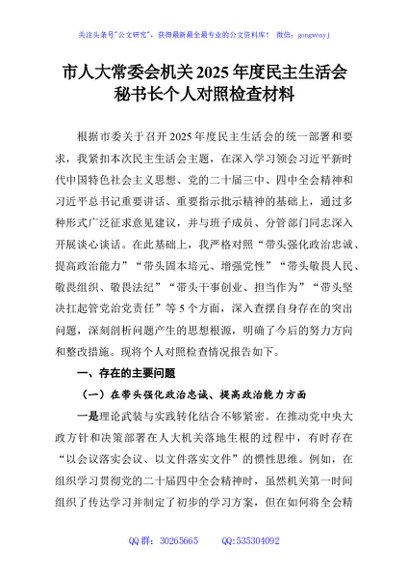 / 市人大常委会机关2025年度民主生活会秘书长个人对照检查材料