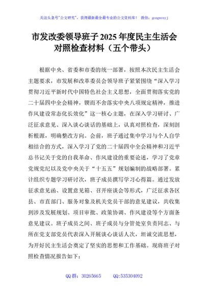 / 市发改委领导班子2025年度民主生活会对照检查材料(五个带头)