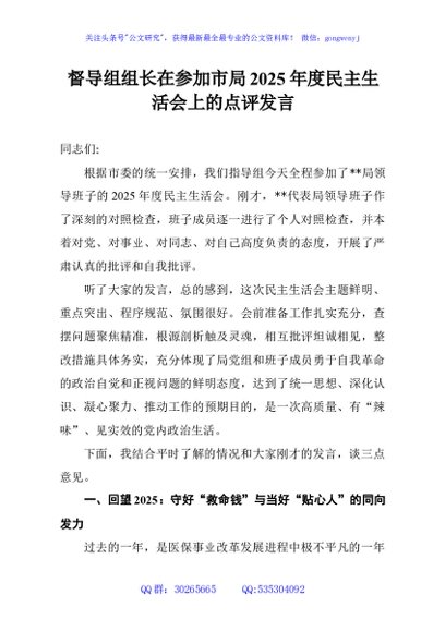 / 督导组组长在参加市局2025年度民主生活会上的点评发言