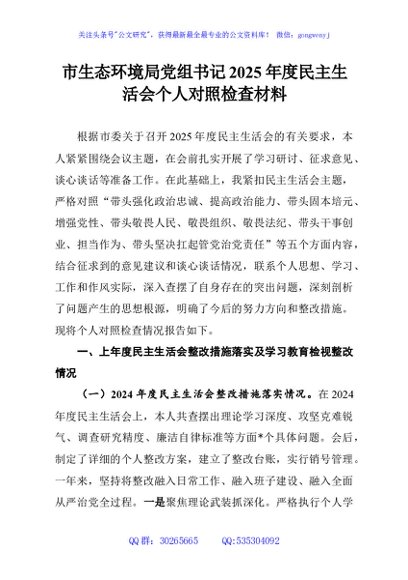 / 市生态环境局党组书记2025年度民主生活会个人对照检查材料