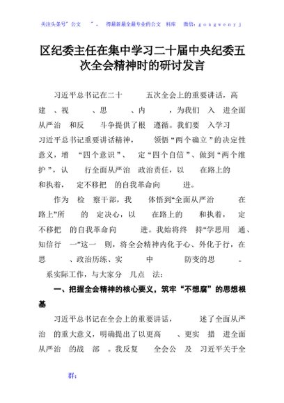 / 区纪委主任在集中学习二十届中央纪委五次全会精神时的研讨发言