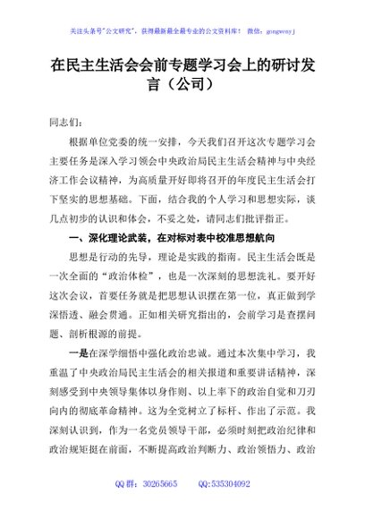 / 在民主生活会会前专题学习会上的研讨发言(公司)