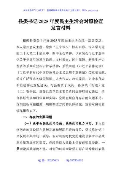 / 县委书记2025年度民主生活会对照检查发言材料