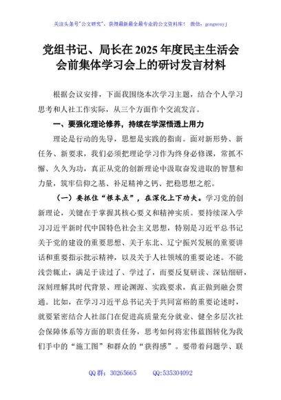 / 党组书记、局长在2025年度民主生活会会前集体学习会上的研讨发言材料