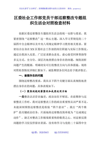 / 区委社会工作部党员干部巡察整改专题组织生活会对照检查材料