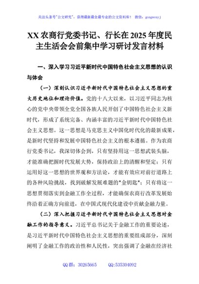 / XX农商行党委书记、行长在2025年度民主生活会会前集中学习研讨发言材料