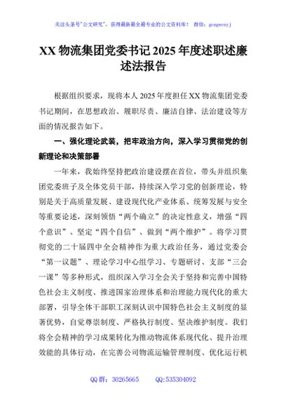 / XX物流集团党委书记2025年度述职述廉述法报告