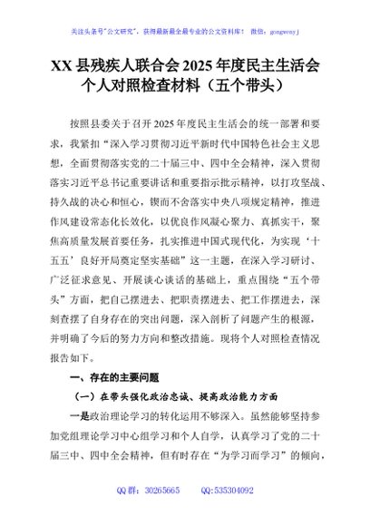 / XX县残疾人联合会2025年度民主生活会个人对照检查材料(五个带头)