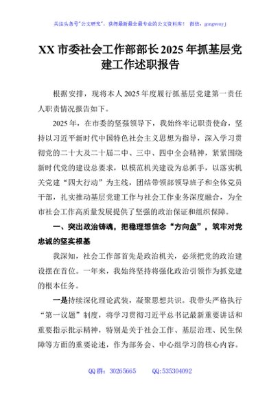 / XX市委社会工作部部长2025年抓基层党建工作述职报告