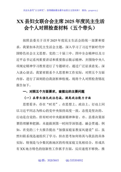 / XX县妇女联合会主席2025年度民主生活会个人对照检查材料(五个带头)