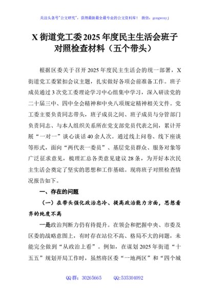 / X街道党工委2025年度民主生活会班子对照检查材料(五个带头)