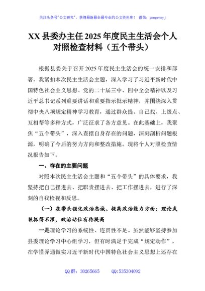 / XX县委办主任2025年度民主生活会个人对照检查材料(五个带头)