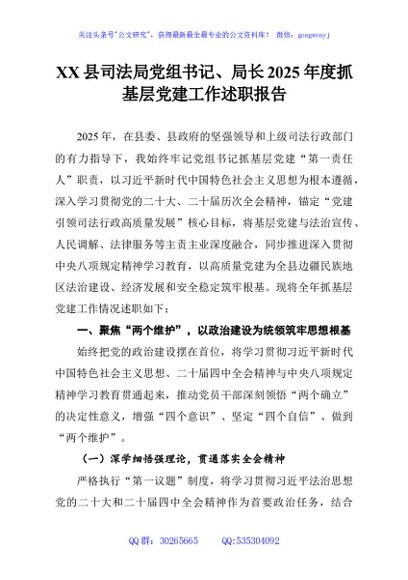 / XX县司法局党组书记、局长2025年度抓基层党建工作述职报告