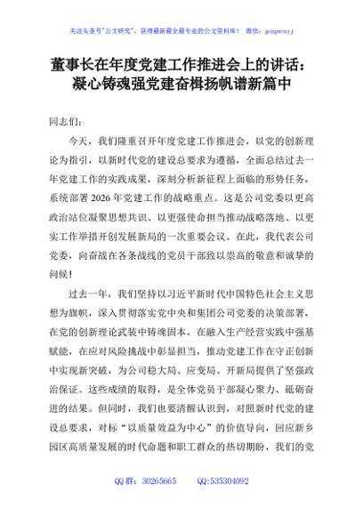 / 董事长在年度党建工作推进会上的讲话:凝心铸魂强党建奋楫扬帆谱新篇中