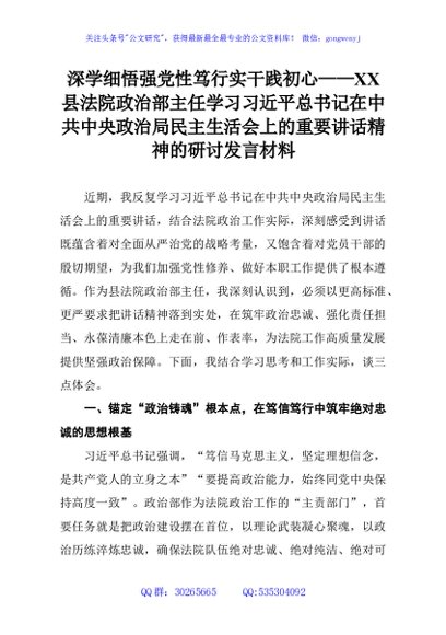 深学细悟强党性笃行实干践初心——XX县法院政治部主任学习习近平总书记在中共中央政治局民主生活会上的重要讲话精神的研讨发言材料