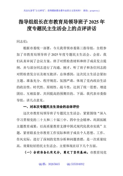 / 指导组组长在市教育局领导班子2025年度专题民主生活会上的点评讲话