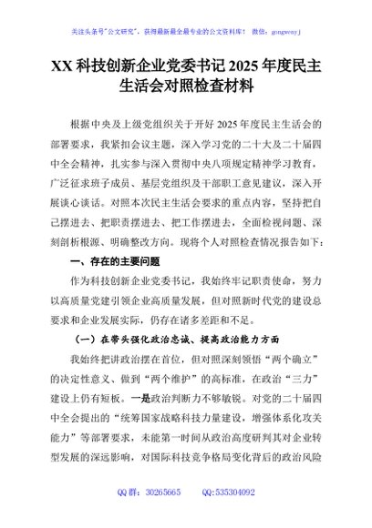 / XX科技创新企业党委书记2025年度民主生活会对照检查材料
