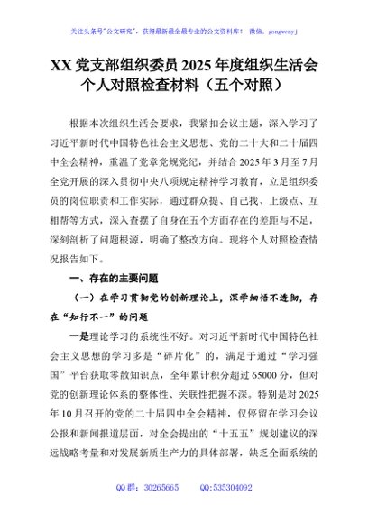 / XX党支部组织委员2025年度组织生活会个人对照检查材料(五个对照)