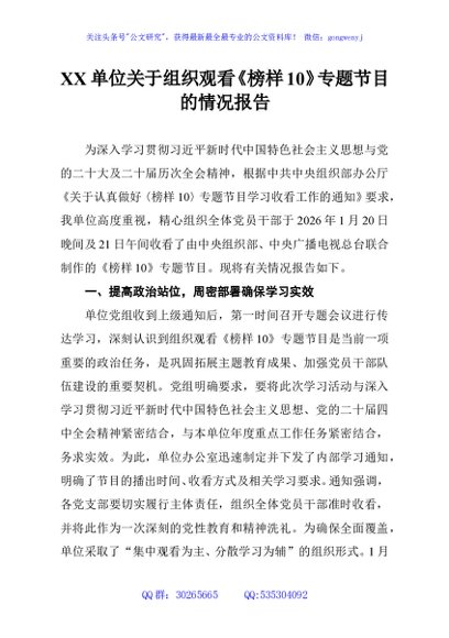 / XX单位关于组织观看《榜样10》专题节目的情况报告