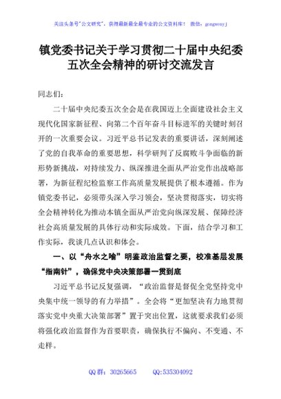 / 镇党委书记关于学习贯彻二十届中央纪委五次全会精神的研讨交流发言