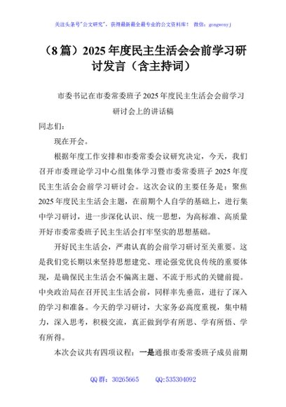 / (8篇)2025年度民主生活会会前学习研讨发言(含主持词)