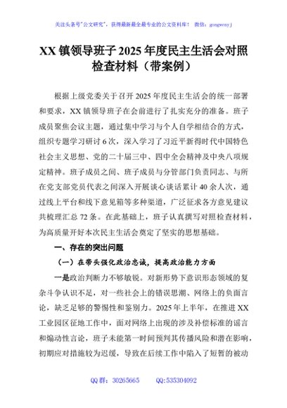 / XX镇领导班子2025年度民主生活会对照检查材料(带案例)