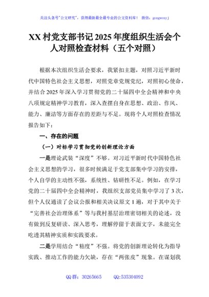 / XX村党支部书记2025年度组织生活会个人对照检查材料(五个对照)