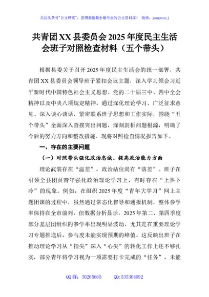 / 共青团XX县委员会2025年度民主生活会班子对照检查材料(五个带头)