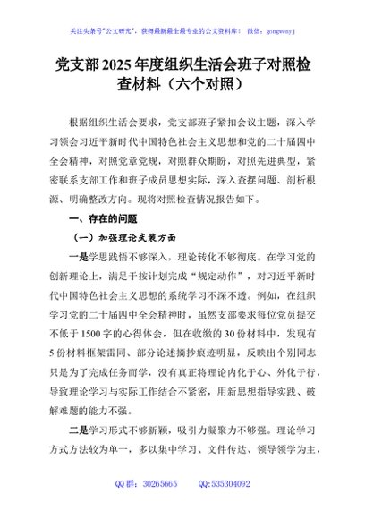 党支部2025年度组织生活会班子对照检查材料(六个对照)