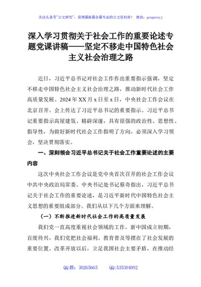 / 深入学习贯彻关于社会工作的重要论述专题党课讲稿——坚定不移走中国特色社会主义社会治理之路